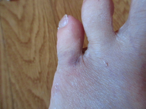 全体重のかかった状態で左足小指と薬指の間が見事に段ボール箱の角へクリーンヒットし、股割き状態になった。もう言葉も出ない位に痛く、やった瞬間「折れた」と思った。小指をぶつけたことは今までの生涯で何度もあったものの、このときほど酷く打ち付けたことはなかった。