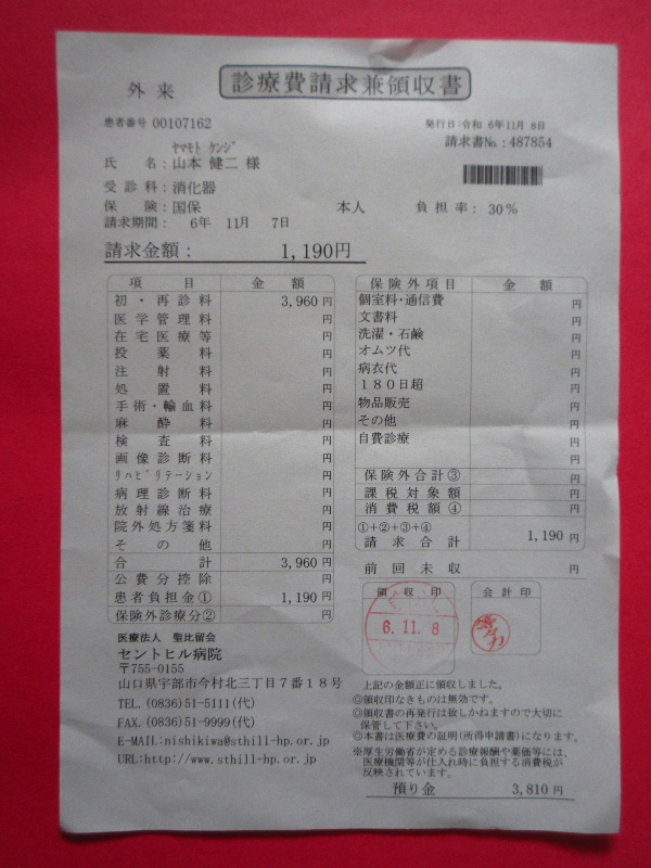 帰宅後、セントヒル病院からの着歴が入っていることに気が付いた。翌日の午後に診察費の精算を行うことを知らされていたので、改めて病院に行った。このときの現地や預かり証も撮影されていない。カウンターで預かり証を提出したところ、実際の診療費が1,190円なので3,810円還付されることが判明した。