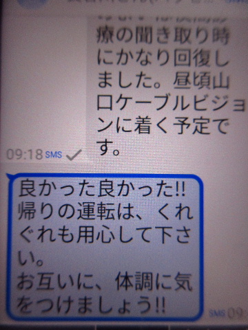 原因が恐らく単なる疲労であり、即座に検査入院という深刻な事態は回避された。帰宅して身体を休めるのが一番という道筋がついてから、翌日私がどうやって本社まで車を取りに行くかを考えた。久し振りに電車で山口入りしてもよかったが、最近収録が滞っている宇部マニニュースの件で岡藤氏とコンタクトを取りたいと思った。平日は大体時間が取れると話していたことを思いだし、状況を説明して山口まで乗せていってもらう都合の良い展開を考えていた。これを受けて松田ディレクターが岡藤氏に連絡をとってくれた。《 翌日(11月8日)の状況 》