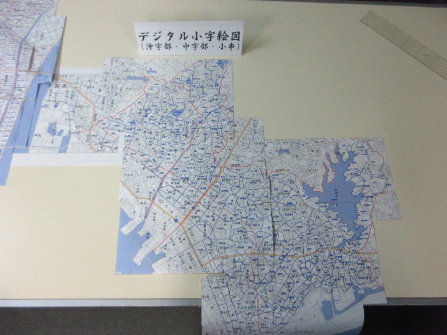 このためギリギリまで迷いながら成果物として今年の後半に注力しデータを作成したデジタル小字絵図を展示することにした。データをメモリースティックに入れて高良オフィスに持ち込み、地理院地図の表示を画像キャプチャし印刷して接ぎ合わせて実現している。