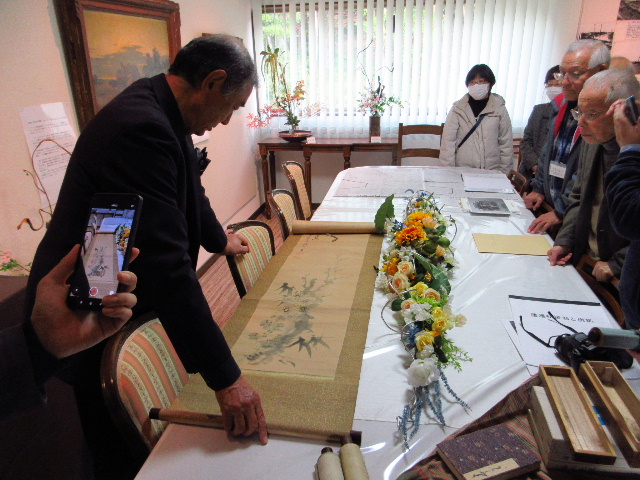 11時半に集估館がオープンし、最後の展示物調整を行った後で館長による開会式が執り行われた。会場には(株)宇部日報社から記者が取材に来た。アーティフィシャルフラワーは視覚的に美しさが理解できる題材だが、歴史物の展示は資料をどう読み解くかは些か困難である。塾長に指名されて展示エリアの主要な掲示物について記者に説明した。