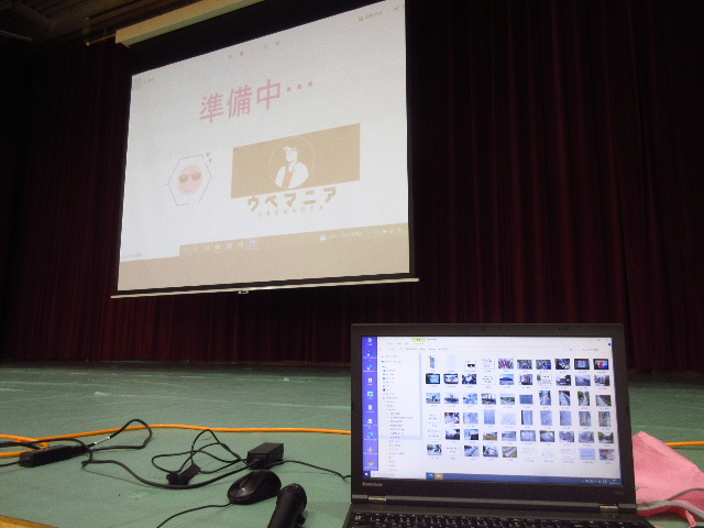 時間に余裕をもって午前8時半に桃山中学校へ到着した。シナリオデータの入ったメモリスティック1本で充分だったが、次に表示する画像が確認できた方がやりやすいので自前のノートPCも持参した。最初に校長室へ通され、しばし歓談し時間が近づいて担当の先生に体育館へ案内された。体育館のステージ上には既に機器がセットされていて、ノートPCにメモリスティックを挿して画像ビューワを起動した。