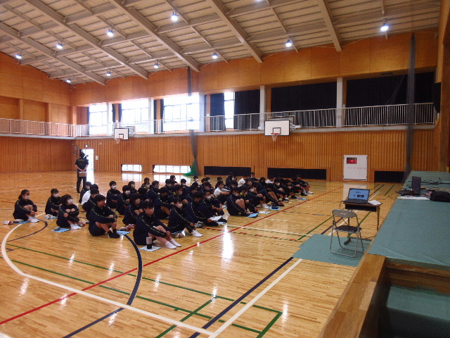 正規のカリキュラムに則った郷土学習への参画は、2月末に行った郷土学習講演会を含めて2度目だが、今回の講話は宇部マニアックスが単独でシナリオを制作し講話を実施した初めての事例である。2月末の講話とは異なり対象生徒数が少ないため、生徒たちは体育館に直座りで聴講し、地区在住者の聴講はなかった。