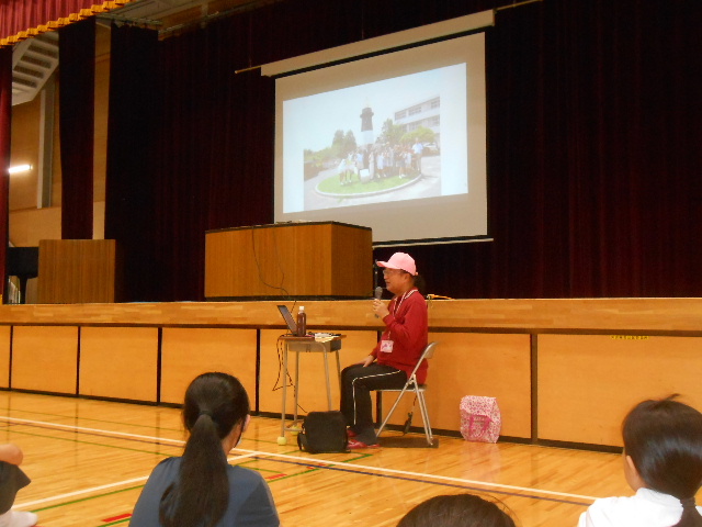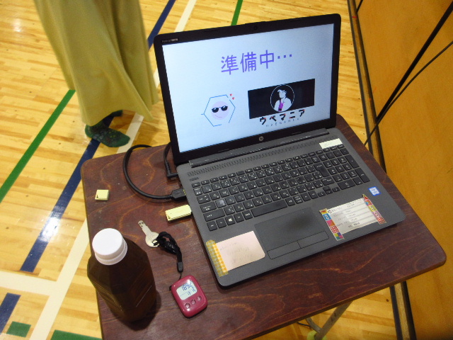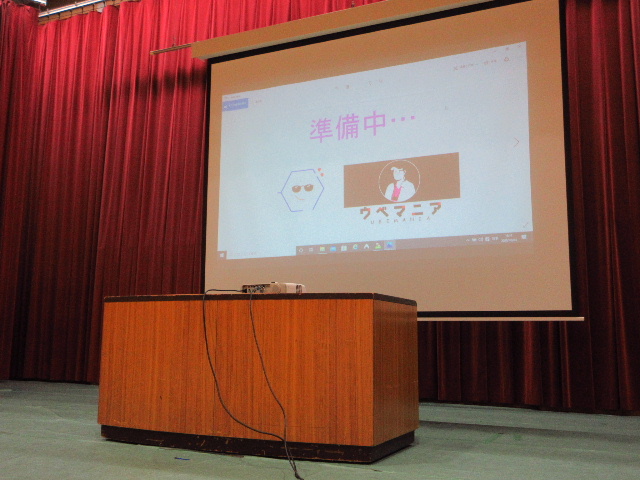 前回と異なり持参したのはデータの入ったメモリースティックのみである。メモリースティックの不具合で読み込めないなどの事態になったら講話自体が成り立たなくなる。念のために常用しているものとサブのメモリースティックに同じファイルセットをコピーした。当日はあいにくの雨だったので、時間に余裕を持ってアジトから徒歩で桃山中学校に向かった。かなり早めに到着したので、体育館で機材の準備ができるまで校長室へ通され、20分程度校長先生とお話した後に体育館に向かった。既にすべての機器がセットされていたので、担当者にメモリースティックを渡すだけだった。問題なく読み込みスクリーンに表示され、ノートPCの矢印キーで操作できることを確認した。