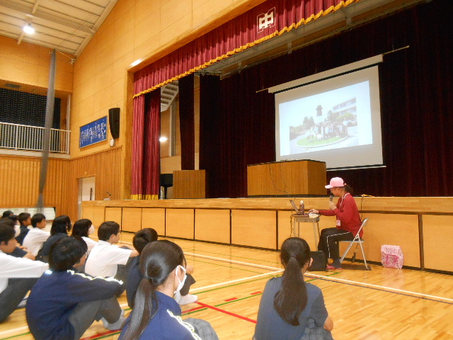 最初と最後だけ生徒も私も起立したが、講話の間は着座してマイクを持って話した。今回は講話終了後体育館で全校集会が予定されていたため、第4幕を話す過程で自前の歩数計[1]を操作して時刻表示させ、話す内容を取捨選択することで予定時間ジャストに終了した。講話実施中に先生方が撮影して下さった画像から2枚載せる。