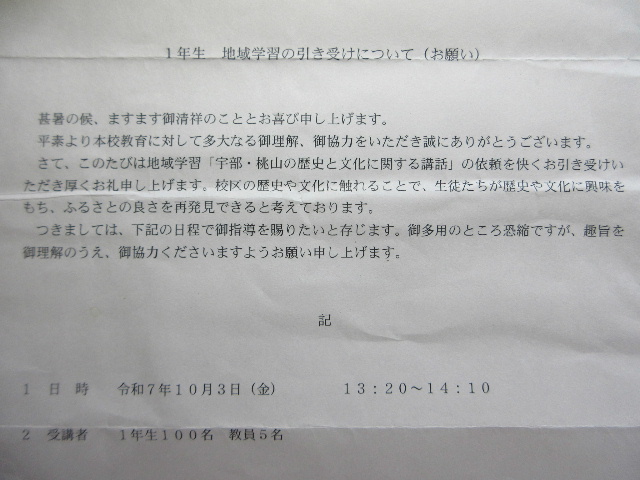 7月31日に私の携帯に知らない番号からかかってきた。通常知らない番号には応対しないが、明白に市内の固定電話からの発信だったので相手が分からないまま応対した。桃山中学校の学年主任の先生からだった。一昨年に最初の郷土学習授業を実施し、今年は1年生を対象に実施したいので同様の講話をお願いできますかという相談だった。私は学年主任の先生を知らなかったが、一昨年実施した講話も他の先生方に混じって聴講しましたとおっしゃっていた。講話のシナリオはPCに保存しているのでその場で快諾した。この時点で講話の実施日や詳細が決まっており、前回と同様に詳細を書いた趣意書を郵送したいので住所などを教えて欲しいと言われた。しかし前回の講話で在籍されていたということと、現在の桃山中学校の写真を撮り直しておきたいという考えもあり、直接受け取りにあがりますと言った。