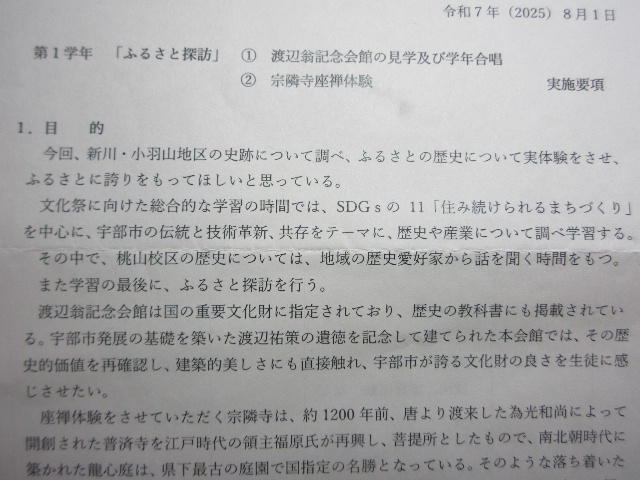 電話した当日と翌日8月1日の午前なら在校していますということで、既に正午近い時間で当日は無理だったので翌日自転車で桃山中学校を訪ねた。学校に着いたとき、何かの会合が開催されるらしく多数の来訪者が玄関から入っていた。私は来訪者対応が終わるまで事務室に通された。やがて学年主任の先生が入って来られ、そこで今回の郷土学習の概要が書かれた資料を受け取った。