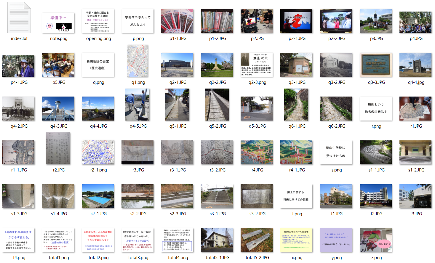前述の通り一昨年の同じタイトルで講話を行っており、対象者が1年生というだけだったので、当初は殆どシナリオに手を加える必要はないだろうと楽観視していた。実施要項を受け取ってから開催日まで2ヶ月あり、優先順位の高い他の作業を行っているうちに[1]9月末になってしまった。前回はまったく初めてということもあり、ノートに全体の流れと話すことをまとめていた。しかし講話を始めるとノートを見るゆとりがないことが分かっていたので今回は話す流れを脳内で想定し、その順序に合った写真を選定した。タイトルのようなテキスト文字も画像化し、矢印キーを操作すれば順繰りに表示される仕様は初回と同じである。