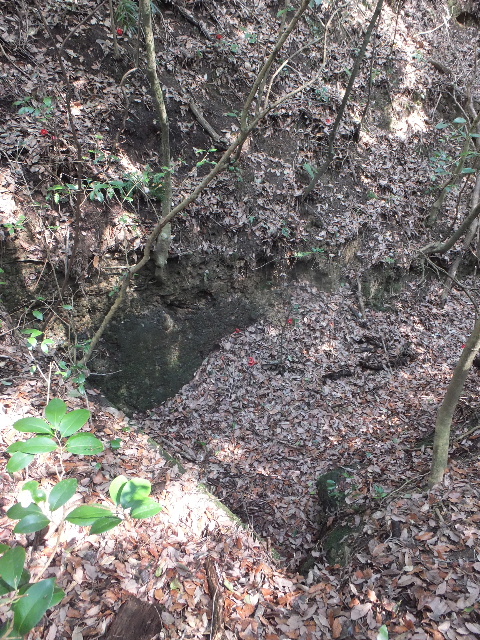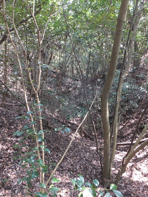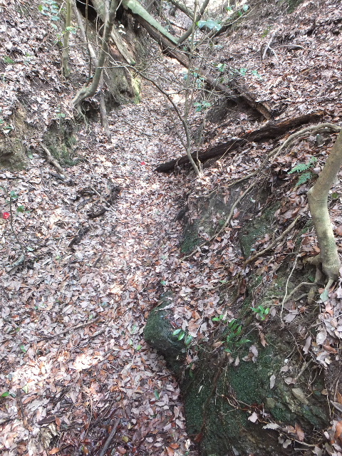溝状領域には夥しい木の葉が堆積していてその下の状態が読めなかった。土砂なら足下を確かめつつ何とかなるが、水が溜まっているなら水路沿いに辿るのは不可能だと感じた。
