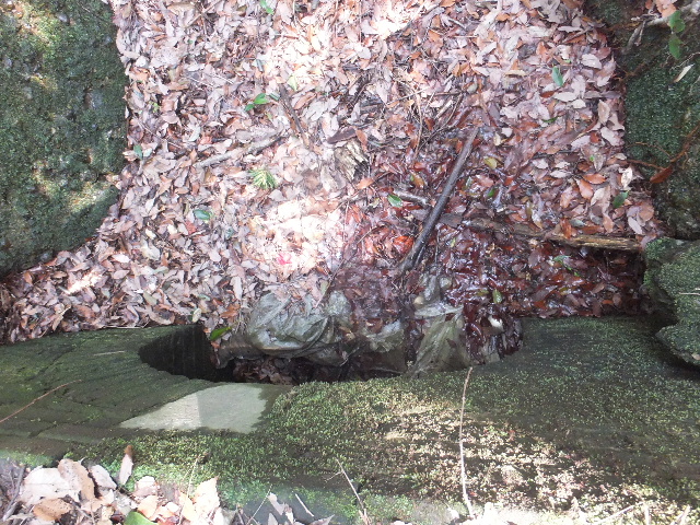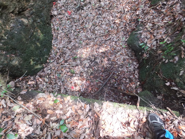 周辺を含めて観察してそのように感じた。沢を先の方まで進めば両側の傾斜が緩くなる場所があったが、斜面も水路内部も著しく木の葉が堆積している。斜面は滑るだろうし水路内部は水がどれほど溜まっているやらも分からなかった。ポータル上からカメラを構えたまま差し出して下を覗き込ませたショット。