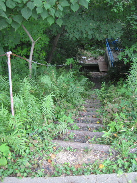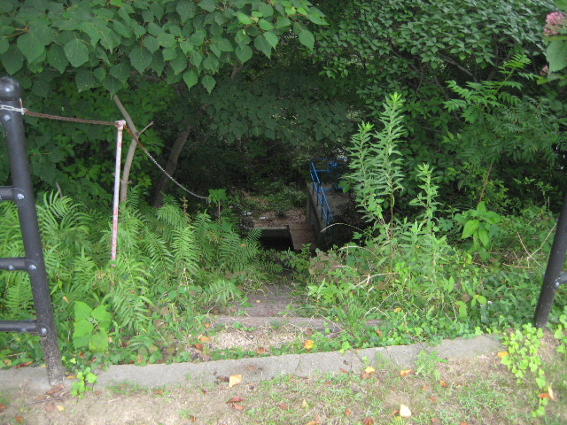 その一角はガードパイプで仕切られていたのだが、一箇所ほど開口部があり、そこから溜め池の方に降りる階段を見つけた。そして一瞥するや私の中の好奇心がすぐに「反応した」。