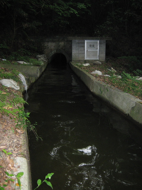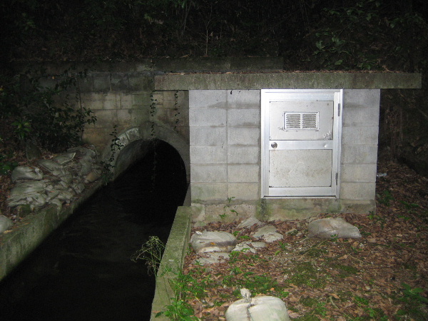 殆ど用水路一杯に水が流れている。これが常盤池から流れ出ていることはすぐ想像がついた。しかし目を見張ったのは、用水を吐き出している部分がヒューム管やボックスカルバートではなく、常盤用水路に見られるのと同じ型式の隧道だったのである。