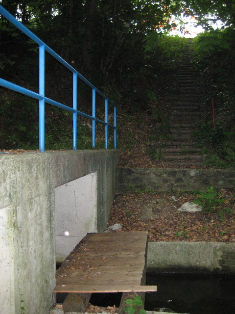 擬木で造られた簡素な階段は、恐らくこの水路へ降りていくためだけに設置されたものらしかった。踏み代が狭く、足を滑らせれば一気に一番下まで滑落しそうだった。