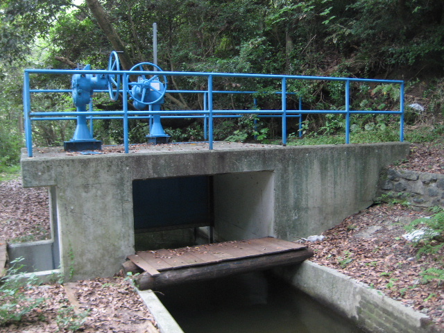 錆び付いた鋼製のバルブが見える。蓋がない桝なので木の葉など溜まる一方らしい。全く操作されないまま何十年も経っていそうな風合いだ。