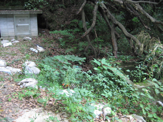 隧道の坑口から少し下流側に、関連があるかどうか分からない桝を見つけた。 先に見た小屋との位置関係はこんな感じで、かなり溜め池側に寄っていた。
