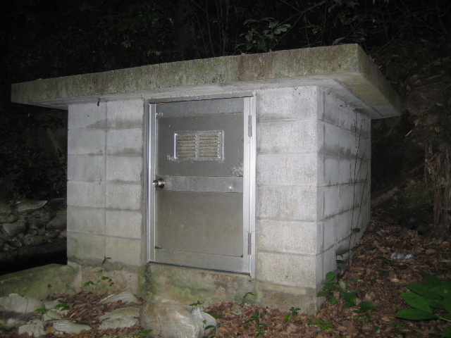 坑口のすぐ横には、謎の施設があった。 ほぼ正方形をしていて、正面にアルミの扉がある。そのまま人が立っては出入りできないサイズで、もちろん開かなかった。この用水路か近接するため池(夫婦池と呼ばれている)に関する施設であることは確かなようだ。