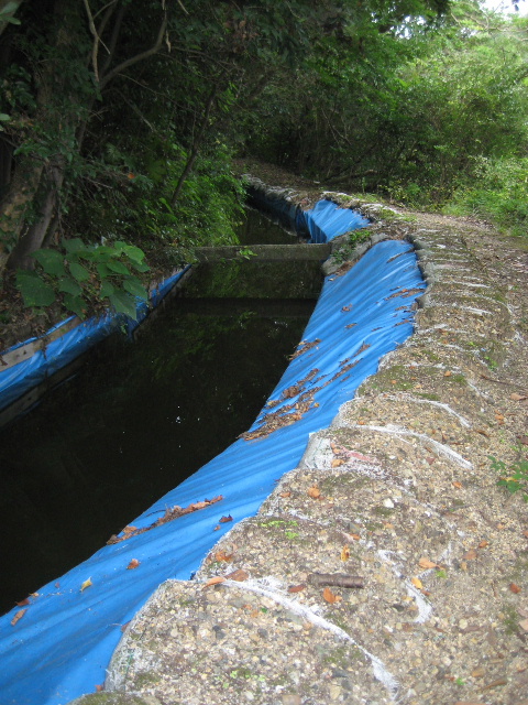 ここが一番酷く傷んでいる。灌漑用水の需要期まで用水路の補修が間に合わなかったのでシートで覆って当座凌ぎしているようだ。