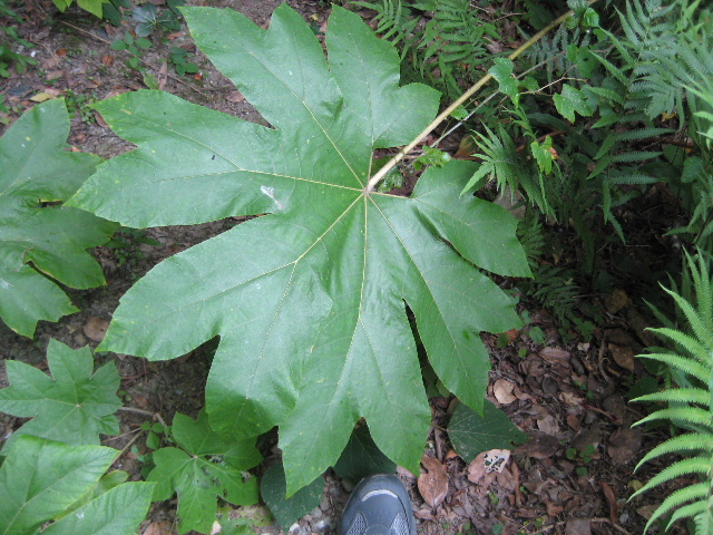殆ど日が差さず、陰がちで高温多湿なこの環境では、直射日光を好まないタイプの木々が化け物の如く生育している。 例えばこのヤツデ。妙に葉の幅が広く、肉厚でしかも異様に大きい。