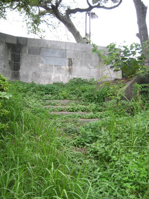 このコンクリート塀は国道に正対しており、常盤公園の銘板が掲げられている。この階段はコンクリート塀の真後ろから夫婦池に向かっており、今は使われていないらしい。