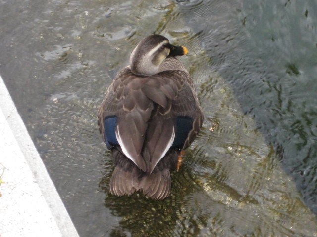 国道をくぐった先で流れゆく用水路に、カモが汀でくつろいでいた。