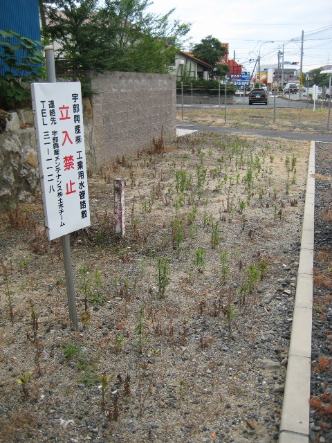 国道を横断した側では用水路が真っ直ぐ伸びているのに対し、工業用水は歩道に沿っていた。■地点に宇部興産(株)の立て札があった。