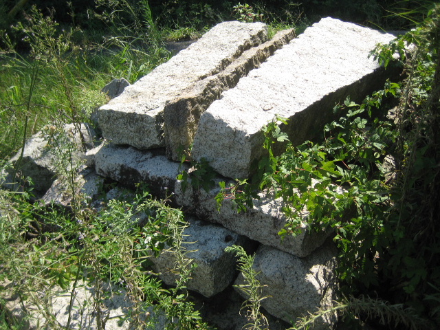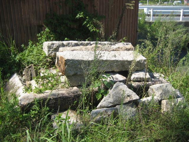 橋の袂に農機具小屋のような建物があってそのすぐ横に加工された石が積まれていた。