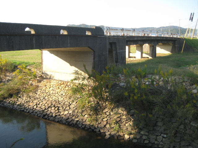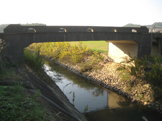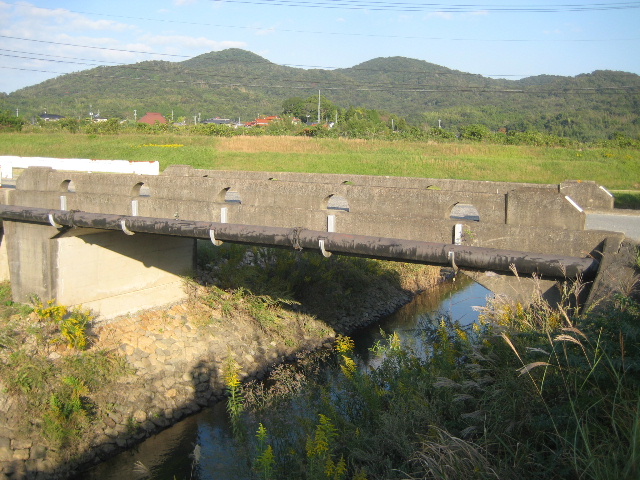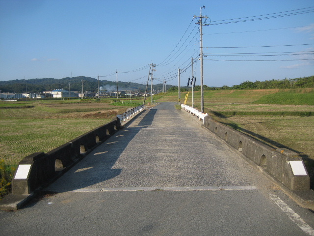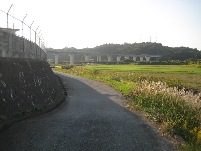 この橋とほぼ同じ長さだけコンクリート橋脚をもつ橋構造が田の上に架かっている。
