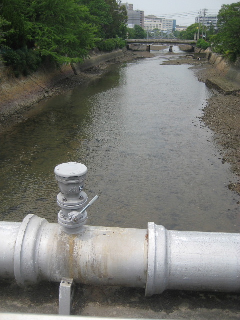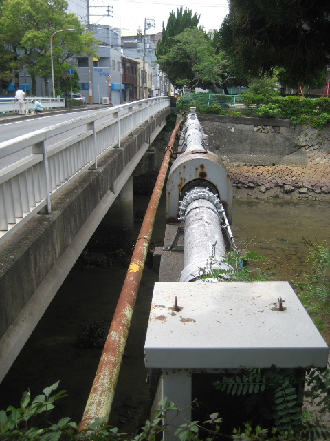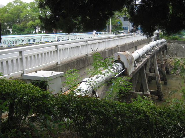 橋ネタが揃ったついでにこの回線を運ぶ橋も記事化しておいた。緑橋と真締川水管橋の間にこのような薄緑色の鋼橋が架かっている。