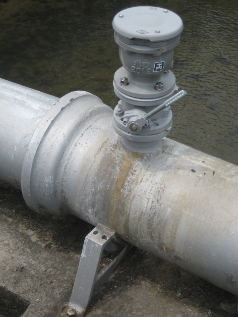 この鋼管にも小振りなバルブが見えている。真締川水管橋の空気バルブよりは小振りだ。