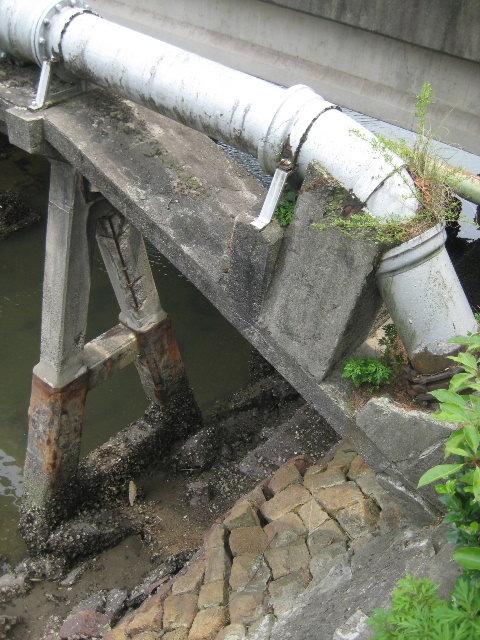 3. 上記[1]において「昭和5〜6年頃本管の45°ベンドが外れて水を噴いた…すぐ上に電話ケーブルが通っていたので修復に大変慌てた」という修繕担当者の談話が記載されている。このことから以前は水道管の上を通していたものを後年緑橋の下流側へ移動し架け替えたものと思われる。