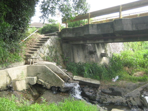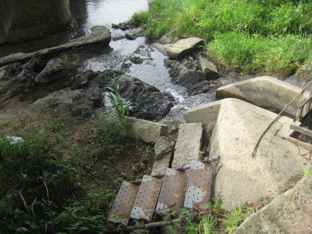 後で述べる堰から導かれた水がそのまま川へ流れ込んでいるのはいいとして河川敷には角柱状の石材が目立つ。もしかすると旧橋のものでは…と思った。