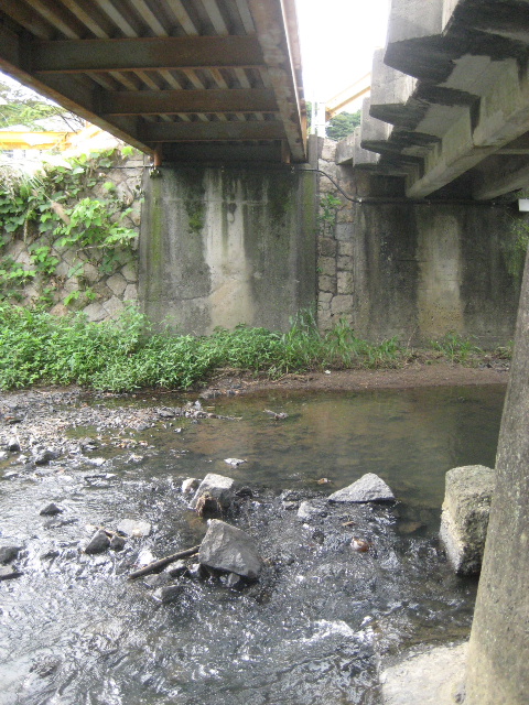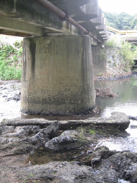 道路橋には中央にコンクリート橋台があり、その近くにもコンクリート殻が散乱していた。自然の露岩も混じっている。