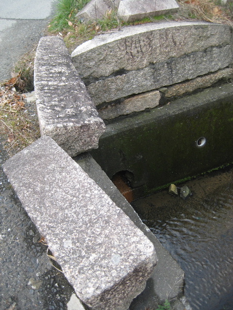 うち棄てられている訳ではないが、恐らく中山観音への参拝用出入口をボックスカルバートに置き換えたとき、親柱を産廃処理するのも畏れ多いと現地へ放置されているのだろう。