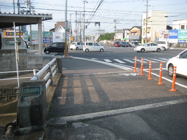 路面に見えているコンクリート部分から分かるように、渡内川は国道を斜めに横断している。
