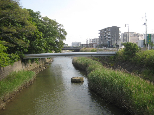 この上流側には竹園橋、鎌田橋という道路橋があり、いずれも似たようにコンクリート床版とガードレールという簡単な構造をしている。それにしても新しさも感じられない。どうしてこの橋が新橋?という疑念を覚える。