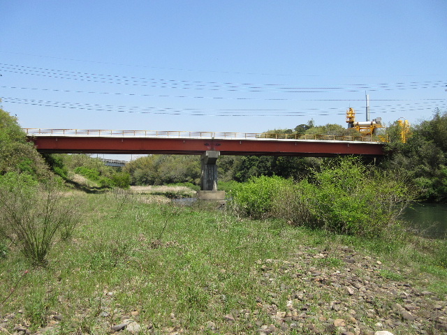 上流側に自転車と歩行者用の橋が並んで架かっている。学童の通学用に後から架けられたのだろう。