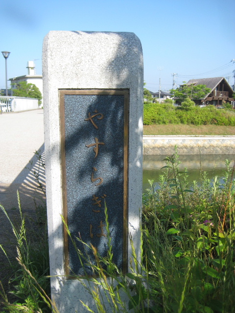 下流側のプレート。平かなで「やすらぎはし」となっていた。