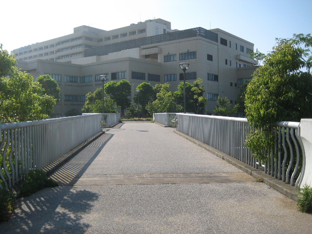 左岸側から見たやすらぎ橋。正面に山口大学病院という構図になる。