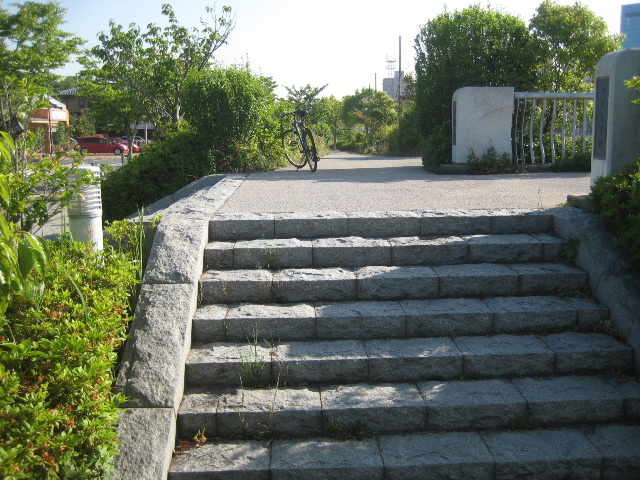 橋は歩道面よりも1m程度高くなっている。橋の接続部から歩道まで距離が短いのでスロープに出来なかったのだろう。