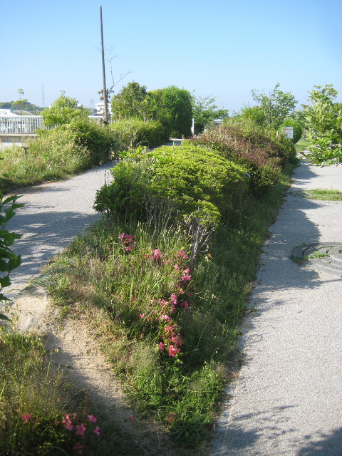 スロープを一番下まで降りるのがタルイと感じる人が多いのか、途中で緑地帯部分を横切って降りる踏み跡がついていた。