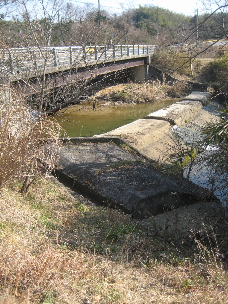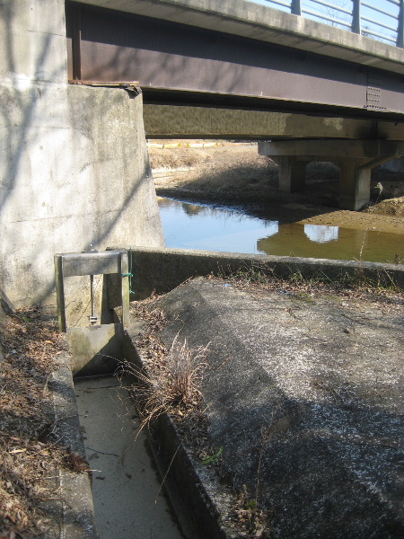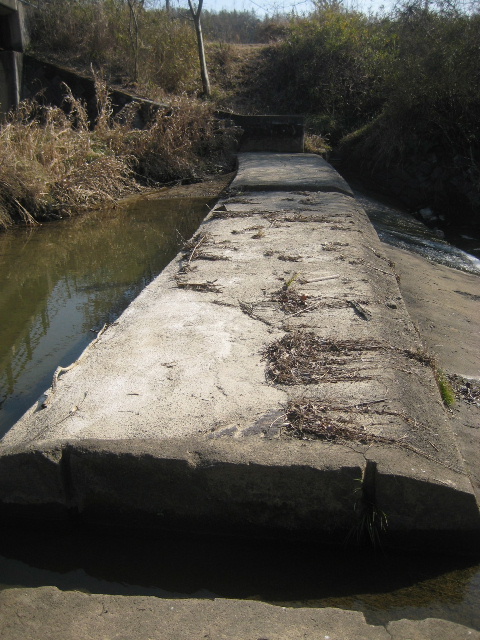 堰いて上昇した用水を導く開渠が下流側護岸にあった。上昇した水はこの溝部分を通って…