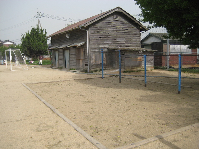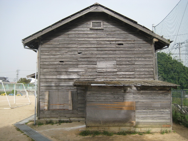 最初に一連の写真を撮った去年(2011年)5月の段階では、この器具庫の他にカマボコ屋根の体育館やプール、更衣室も私の幼少期から同じ形で存在していた。
