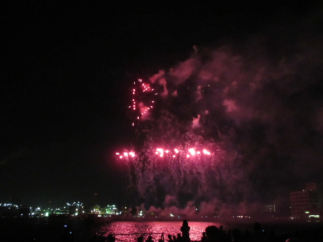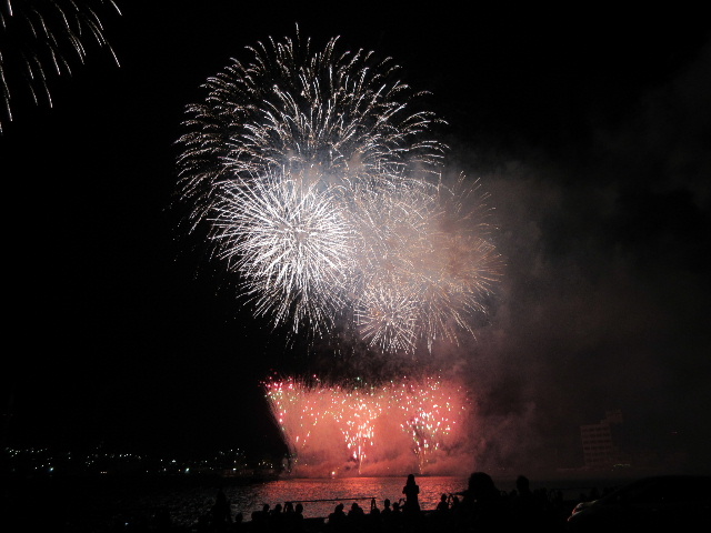 2014年は花火大会を前に控えてデジカメ故障に見舞われ、7月下旬に新しいデジカメを購入し撮影しました。大々的な記事は書かないもののテストを兼ねて撮影はしておきたいと思いました。それで条件を合わせるため今年も風下となる港町埠頭から撮影しています。デジカメはフラッシュ強制オフ以外は既定のままの撮影モードで行っています。[3](リサイズによる劣化を抑えるために若干大きめのサイズにしています)