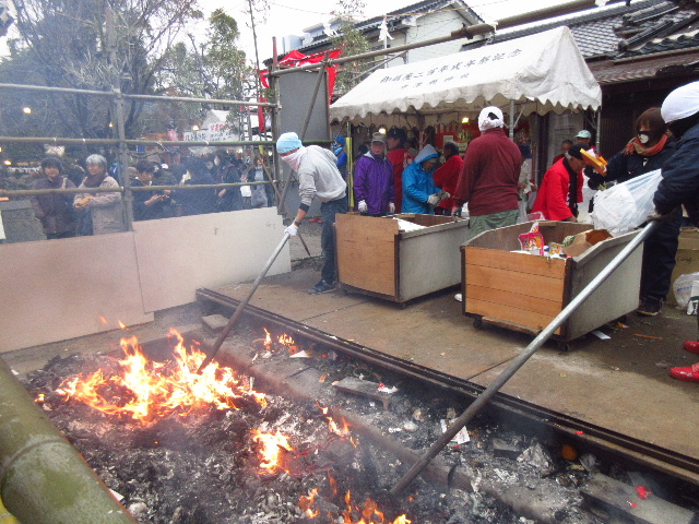 以前は境内の中央に縄張りし、各自が紙袋などに入れて持参した正月飾りを自己責任で投入していた。安全上の問題により、現在では係員に手渡して火勢を見ながら燃やす方式に変更されている。
