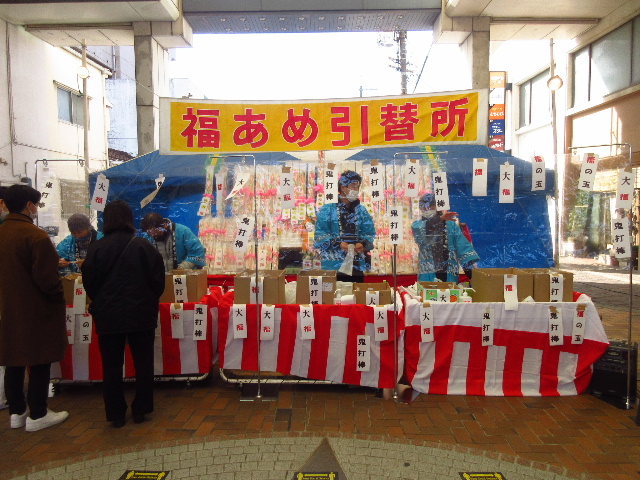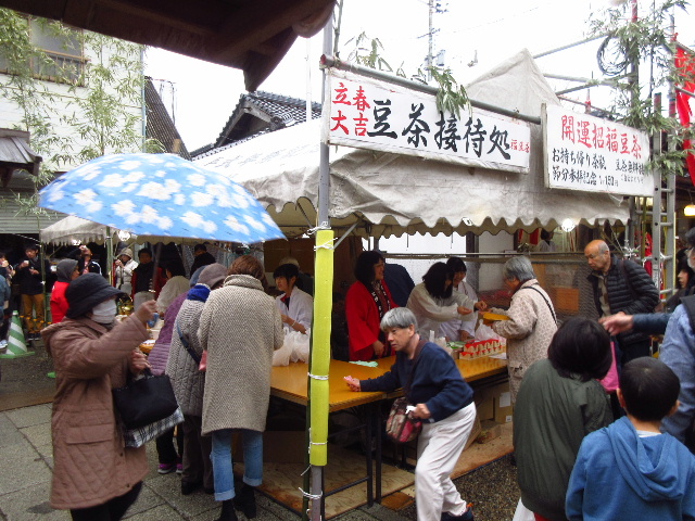 境内に櫓を組み、その上から年男・年女が豆を撒くこれも全国的な儀式である。豆だけでなく子ども向けのお菓子が撒かれることもある。