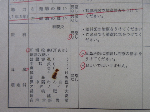 夏期が近づくと体育の授業で水泳が始まる。水泳の授業を受けるにあたってはすべての学童が保健室で耳と鼻の検査を受ける必要があった。耳鼻咽喉科医が学校に出向いてすべての学童の鼻の奥を調べ、結果が通知された。学童に渡されるのはB5わら半紙の一枚もので、検査項目の説明と結果通知として「異常なし」「耳鼻咽喉科への通院を前提に許可」「泳いではいけません」の3つがあって、該当する項目に赤で丸が記されていた。この通知で鼻か耳が原因で、耳鼻咽喉科に通院しなければ泳いではいけないことが通告された。