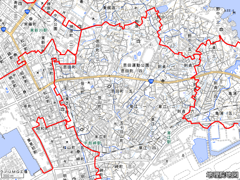 3. 沖ノ旦橋の東側は西宇部地区に属しており、西宇部地区を単一領域にするために厚東川に面した部分も境界を描いているため、厚南地区を描画すると河川にしか接していない境界線が表示されてしまう。
