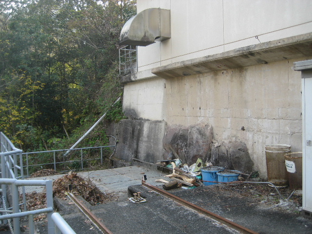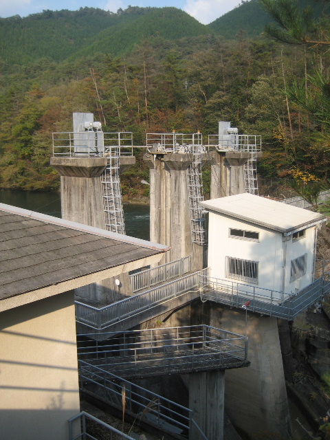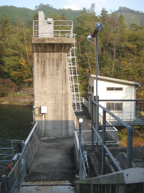 操作室は堰堤中央部で下流側へ突き出す形で設置されている。建て屋の外にあるグレーチングの通路に支えはなく、完全な宙づり状態だ。
