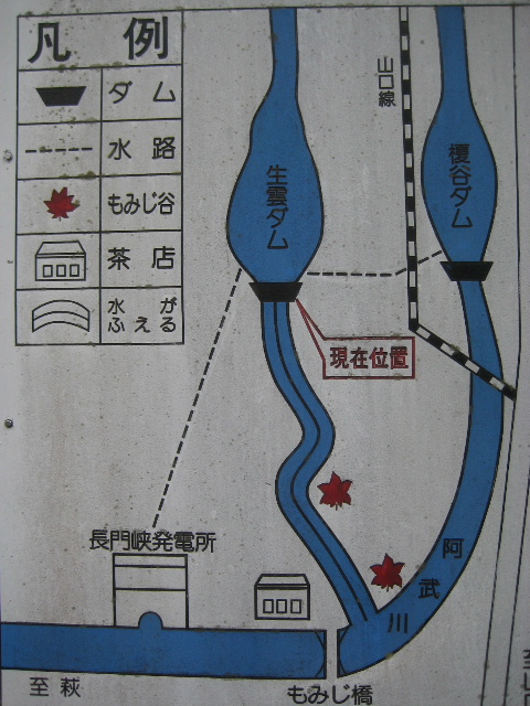先ほど訪れた榎谷取入口から生雲ダムへ、そして長門峡発電所まで阿武川の水を導く水路が明記されている。