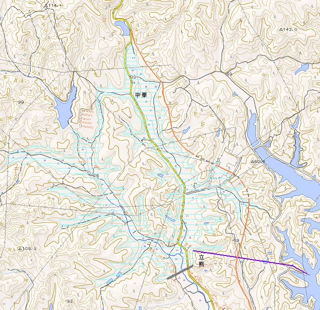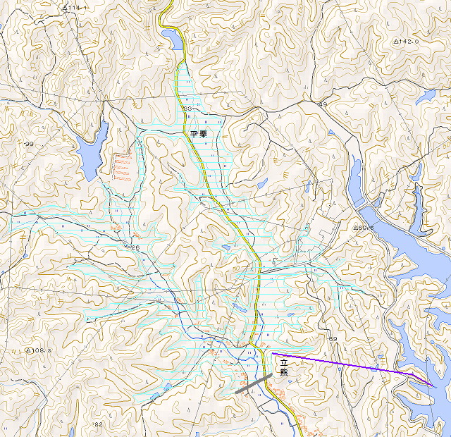丸山ダム湖より水を送るので、大坪ダム湖の計画水位は当然一致する。このことと書籍[1]別添の計画図を参考に、大坪ダムによって水没する範囲を地図に書き込んでみた。